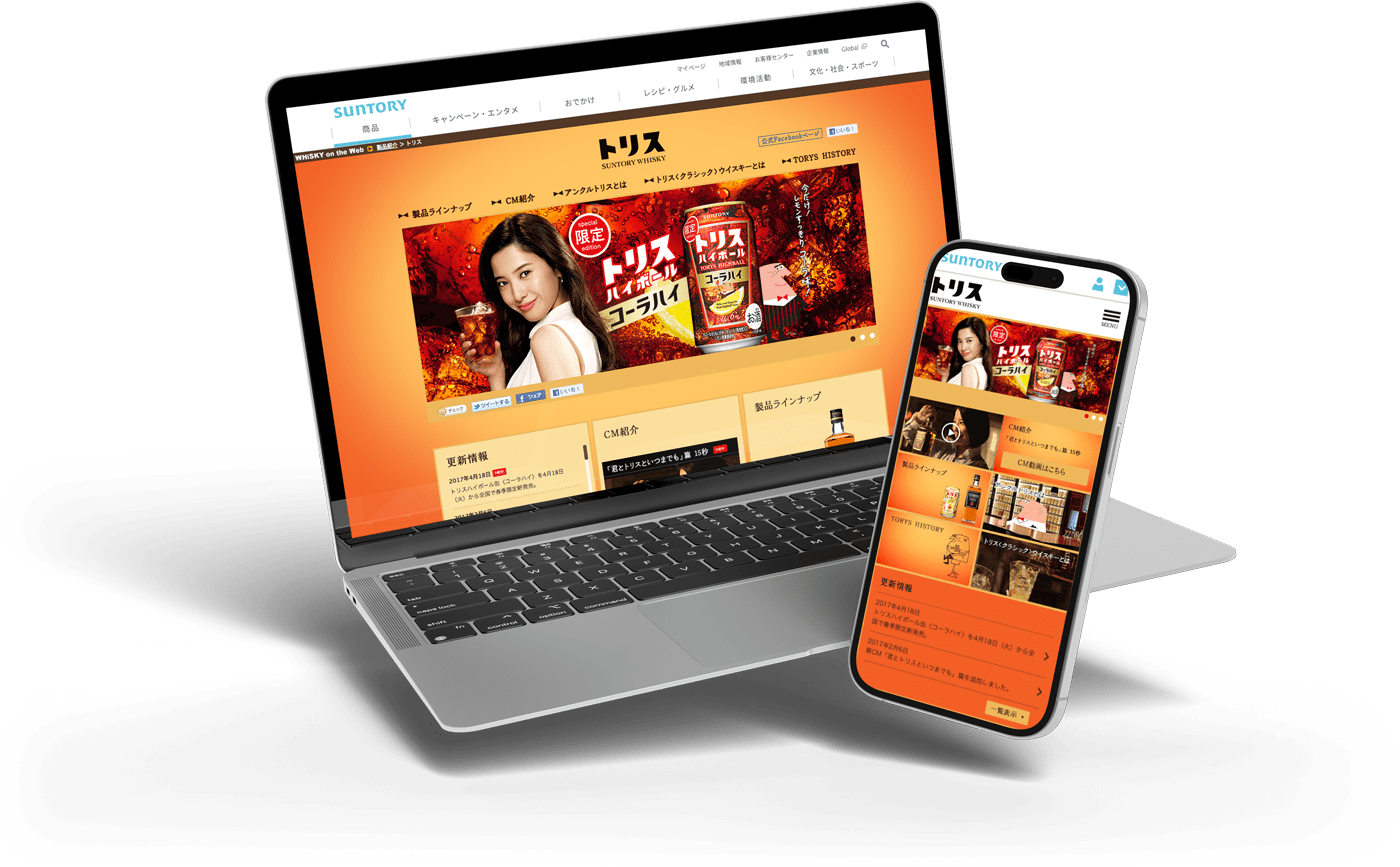 トリスが持つ〈親しみ・軽やかさ〉を核に、語り口・色調・モジュールグリッドを再定義。ロングセラーの歴史や味わいの個性が“読み進めるほど自然に伝わる”情報設計に整えました。見出し〜本文〜補助ビジュアルの階層を明快にし、スクロールに同調する最小限のモーションで要点を強調。結果として、記憶に残る体験とブランド理解/ブランド醸成を両立しています。ディレクションは顧客折衝と進行管理を中心に、要件整理・レビュー体制・素材差し替えフローを一本化し、制作と運用のガバナンスを確立しました。
