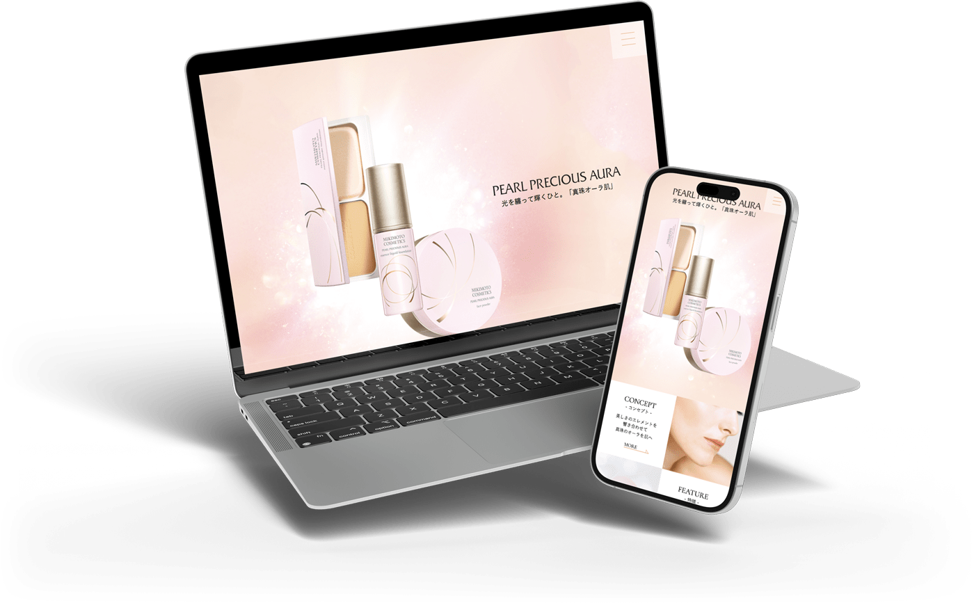 “光を纏う”世界観を核に、PEARL PRECIOUS AURAの価値を読みやすく伝える情報設計に再編集。トップでコンセプトを端的に提示し、CONCEPT/FEATURE/PRODUCTの三章構成で理解が段階的に深まる導線を設計しました。色調は真珠の穏やかな艶感を基調に、余白・字間・階層設計で可読性を担保。画像のトリミングとモジュールグリッドで視線移動を最短化し、必要最小限のマイクロモーションで要点だけを強調しています。これにより、ブランドの哲学とメイクアップの表現力が記憶に残る体験として立ち上がるようデザインしました。