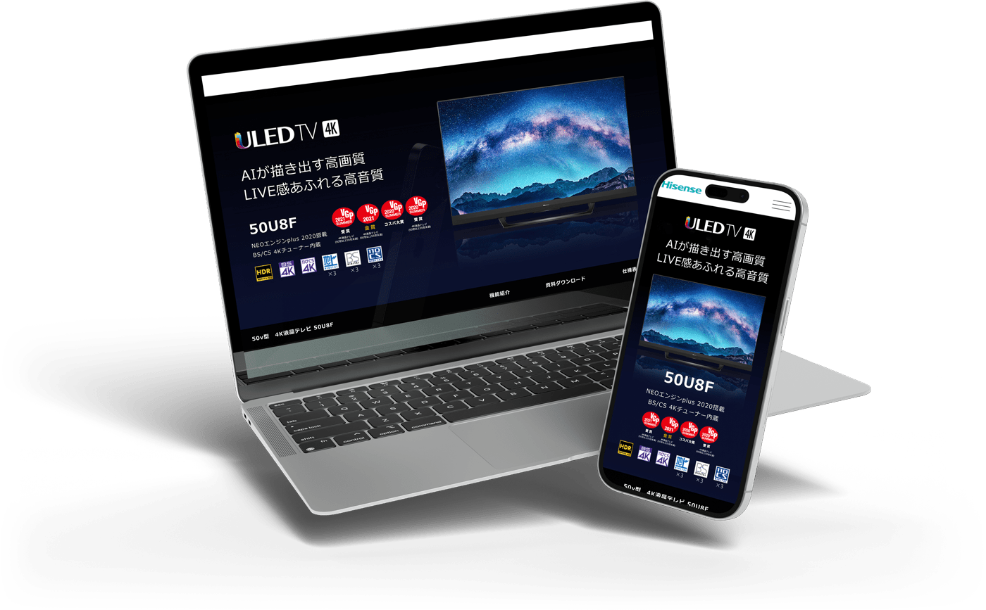 Web制作では映像を中核に据え、テレビの滑らかな高画質感をそのまま体験へ変換。ページ設計・モーション・画質最適化を丁寧に詰め、他媒体との一貫性と記憶定着を高めています。ディレクションでは要件整理、スケジュール/レビュー体制、制作–クライアント間の合意形成をリード。ブランド理解とブランド醸成を軸に、クロスメディアでの成果最大化を図りました。
